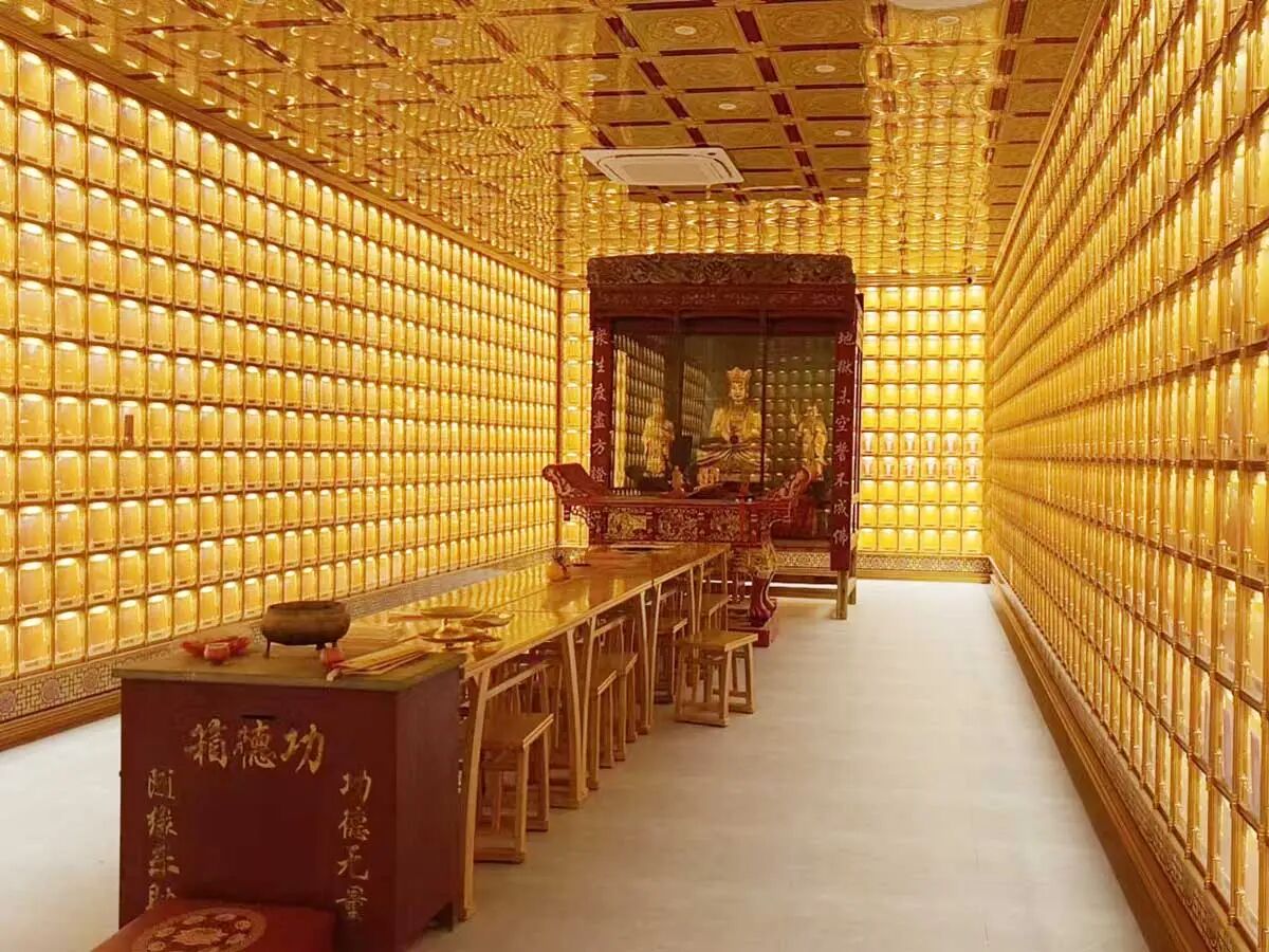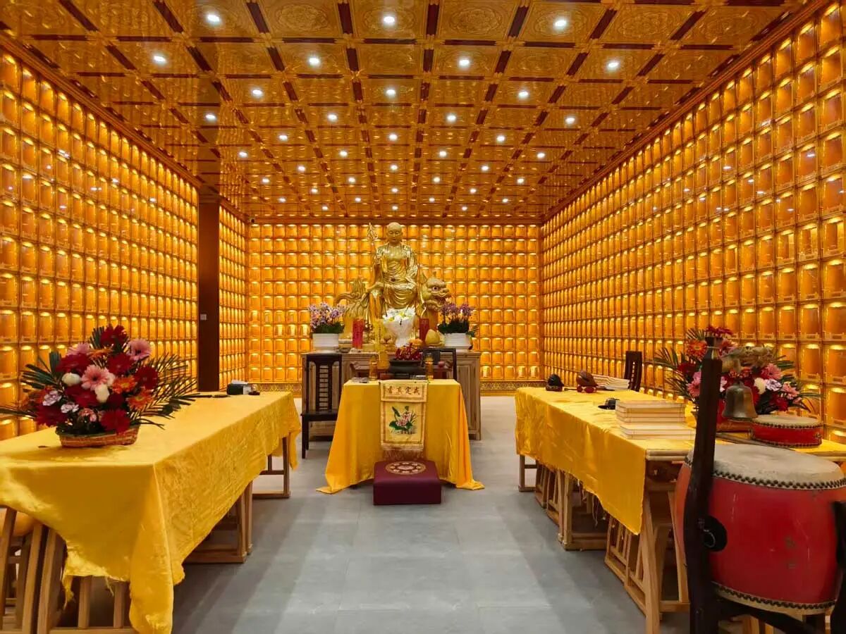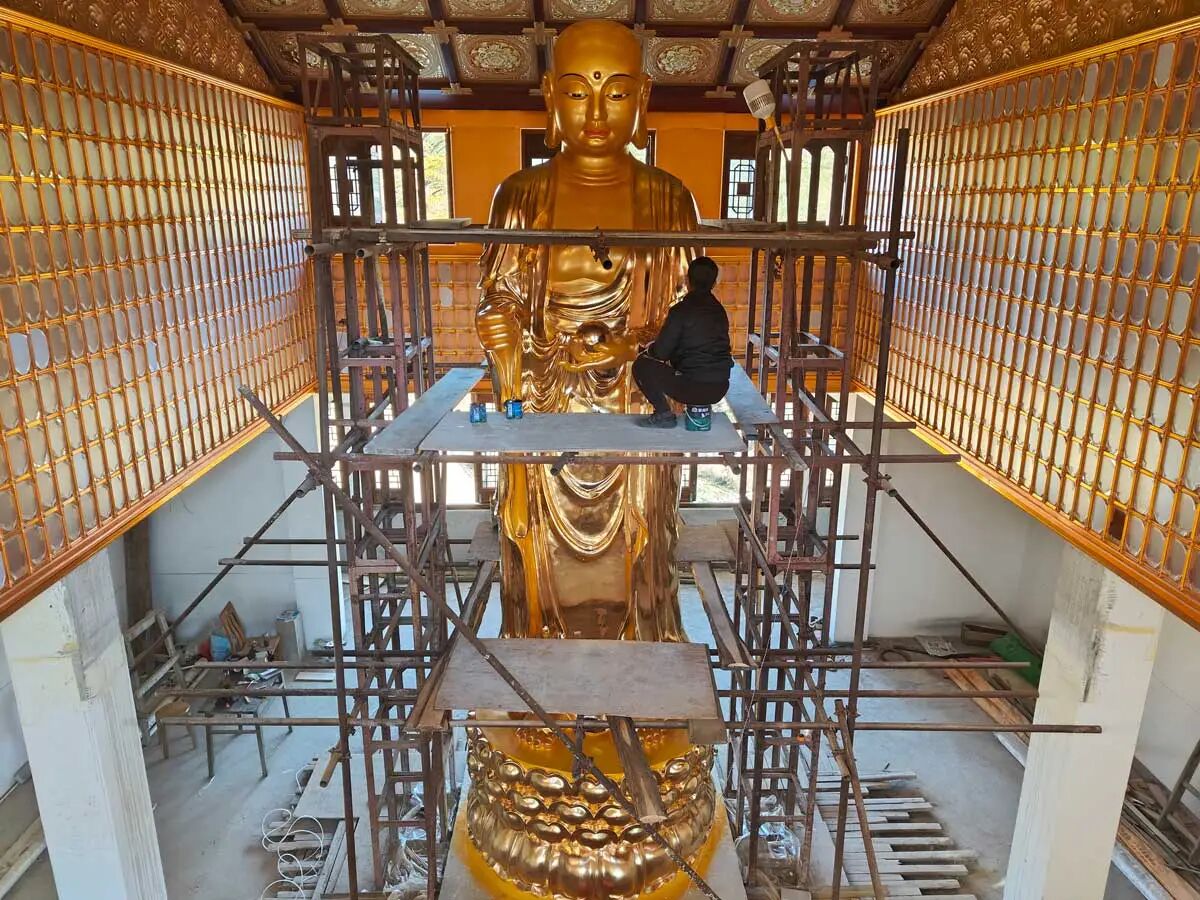 地藏殿6.6米地藏王菩萨圣像贴金圆满,毫光静照,欢喜庄严。贴金工序皆以古法施作,令心安古刹道场焕发新辉。同时,完成地藏殿及连廊莲花吊顶安装施工。并完成大殿卫生清理,待地砖铺设施工。对地藏殿顶部原建木制窗进行了拆除,更换合金材料门窗。
