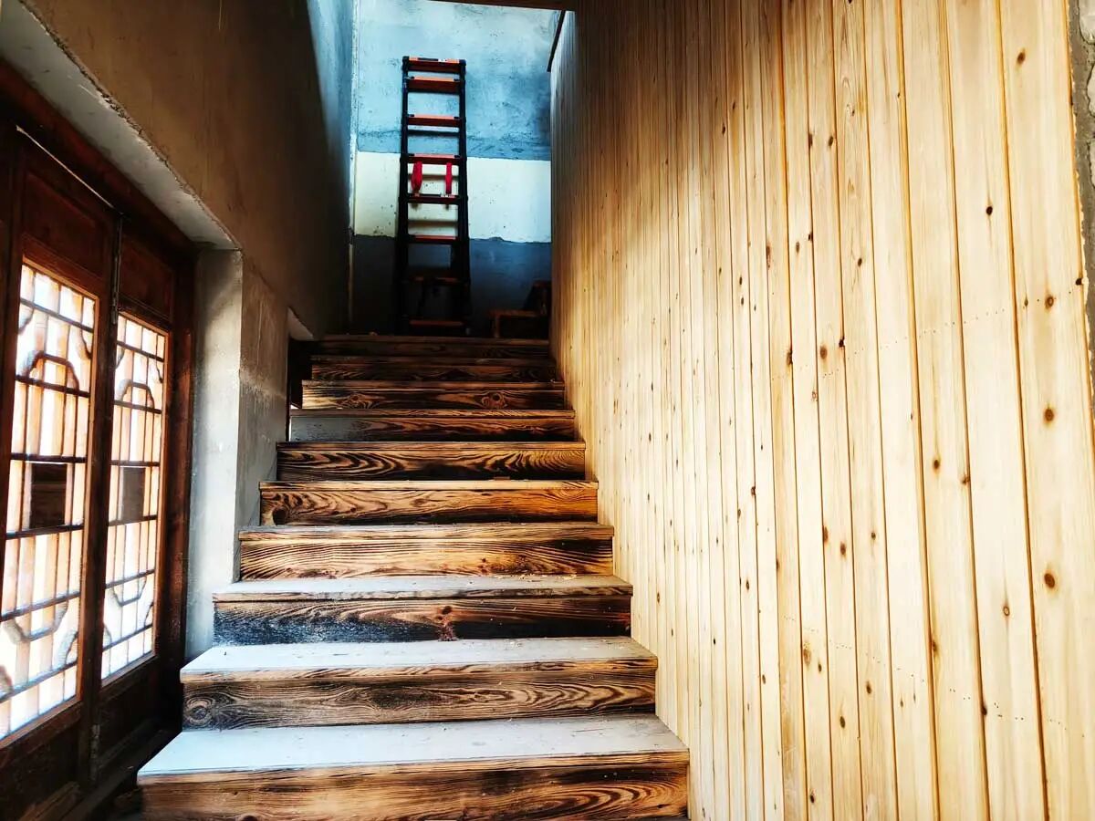 地藏殿配套僧舍完成了隔墙、防水、毛坯粉刷以及地板铺设、传统木门的制作、安装。大殿偏侧楼梯木板隔墙施工完成、火烧木型的楼梯板铺设完成。