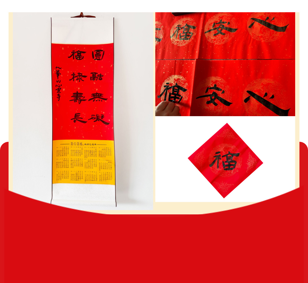 每套内有 :一张福字和两副对联、一副卷轴、一枚福袋。